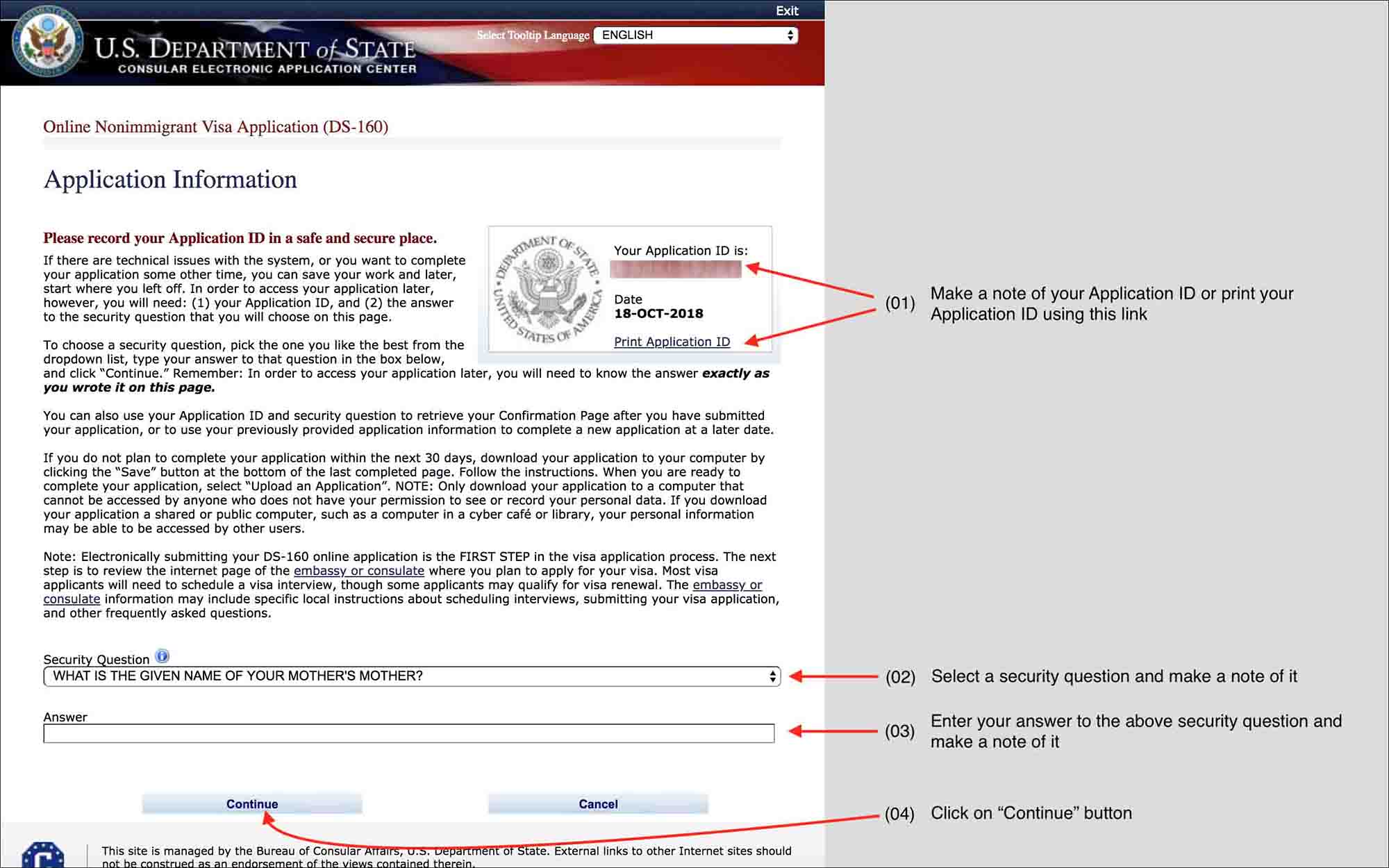 Bạn sẽ phải điền đầy đủ thông tin vào tờ khai. Câu hỏi bằng tiếng Anh nên bạn cũng phải trả lời bằng tiếng Anh. Bạn nên in mẫu đơn ra trước và đọc hiểu trước các câu hỏi. Tránh để trường hợp khi khai vào đơn mà thông tin không chính xác. Nếu tiếng Anh của bạn không tốt thì nên nhờ người dịch sang tiếng Việt để hiểu chính xác câu hỏi. Sau khi hoàn thành mẫu đơn bạn sẽ “submit”. Sau đó in xác nhận mã vạch để nộp vào Đại sứ quán.